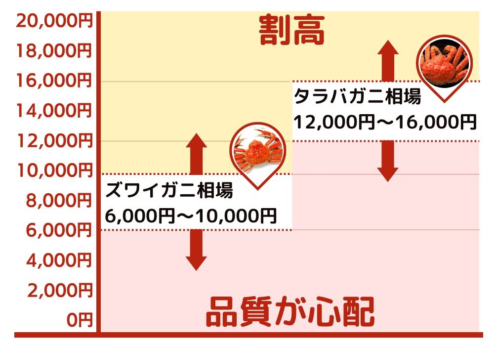 ズワイは6,000円~10,000円、タラバガニは12,000円~16,000円くらいの価格が相場です。