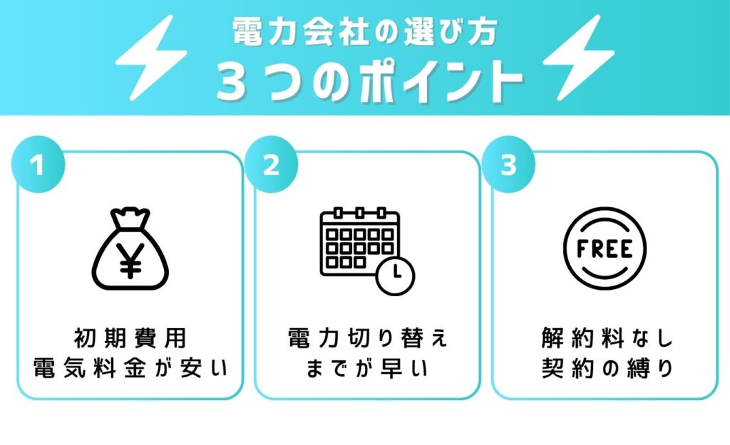 電力会社を選ぶ際は、以下の3つのポイントをチェックしましょう。