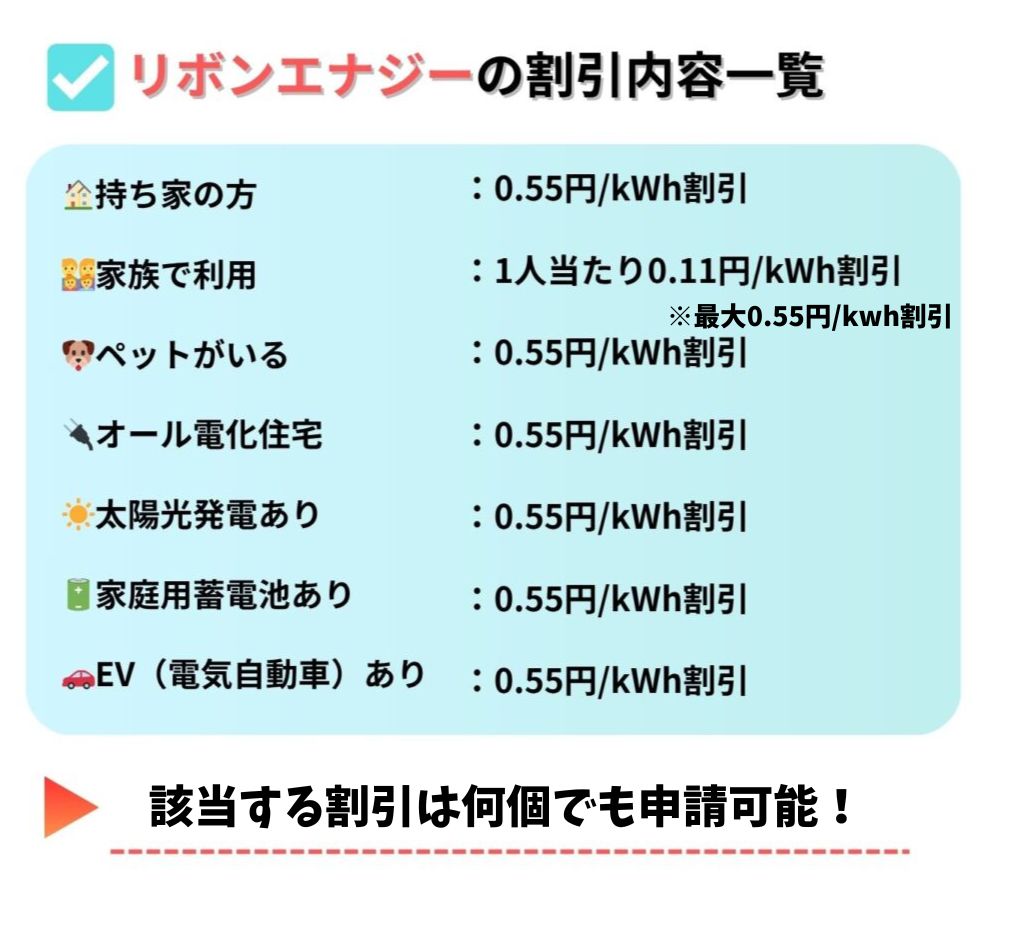 他社にはない、リボンエナジ―の最大の魅力がこの割引制度。条件を満たせば最大7つの割引が適用でき、1kWhあたり最大3.85円引き!